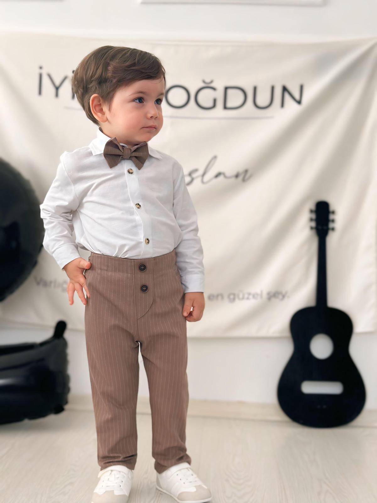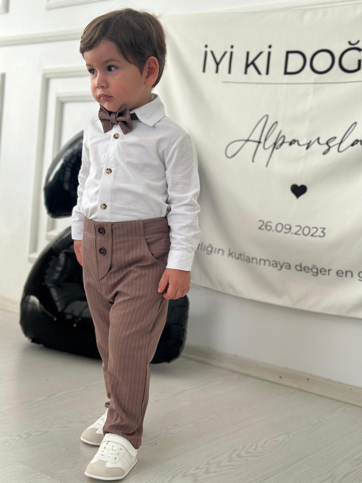 Kahverengi Çizgili Gömlekli Papyonlu Takım